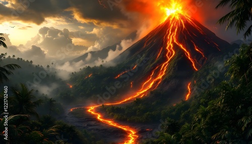Ultra-realistic image of an active volcano erupting in the midst of a tropical rainforest, with lava flowing down the sides of the mountain and lighting up the dense jungle below. The eruption