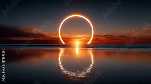 Ultra-realistic sunrise seascape with a flat glassy ocean reflecting an enormous golden sun and a perfect solar halo ring, creating a stunning visual effect over the horizon with copy space