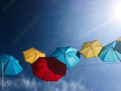 Umbrellas on a line