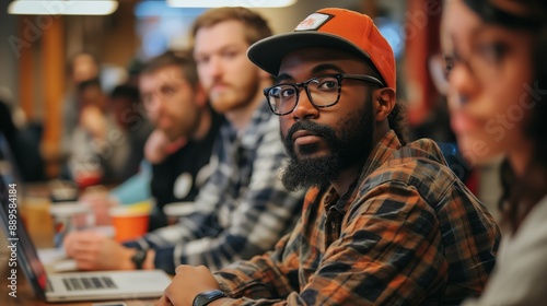 Un ragazzo di colore programmatore di software in primo piano, con il team di sviluppo sfocato dietro.