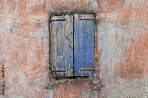 Un vieux volet en bois bleu avec de la peiture ecaillée et un mur ocre ancien d'une habitation a Guillestre un village de montagne dans les Hautes-Alpes de France