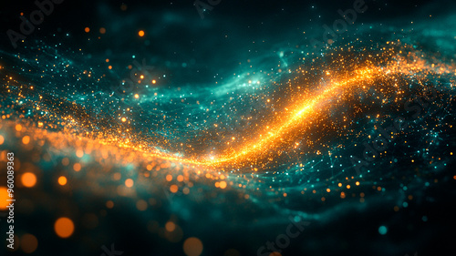 Una visualización abstracta del entrelazamiento cuántico, con partículas de luz que se conectan a través de distancias mediante patrones y símbolos cambiantes y geométricos. Estas conexiones digitales