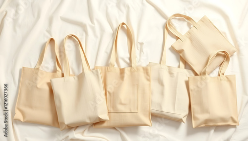 "Unbranded Eco-Friendly Grocery Bags with Blank Surface" – A mockup showcasing plain eco-friendly tote bags made of jute or cotton, displayed on a clean, neutral-toned background.