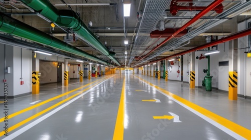 parking, garage, underground, pipe, infrastructure, floor, marking, maintenance, building, industrial, concrete, plumbing, electricity, cable, wire, lighting, safety, security, design, architecture, modern, clean, roomy, empty, line, yellow, green, red, metal, steel, construction, engineering, technology, energy, system, facility, service, transportation, vehicle, commercial, property, real estate, business