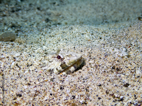Underwater close up of a Diamond Lizardfish, synodus synodus, buried and camouflaged in sand. Underwater predators at the Canary Islands, Spain.