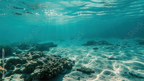 Underwater exploration a majestic coral reef with sunbeams illuminating the deep blue sea and diverse marine life