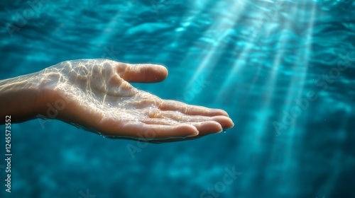 Underwater horizon composition, gentle hand interaction with water, translucent aqua tones, light rays penetrating surface, rippling water effects, conservation photography