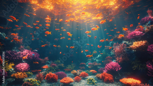 Underwater Paradise: A mesmerizing underwater scene with vibrant coral reefs and a school of fish swimming through sunbeams. The image evokes a sense of tranquility and wonder, highlighting the beauty