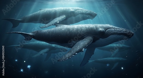Underwater scene of whales swimming in the deep ocean with sunbeams