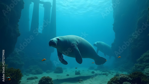 Underwater tale, Manatees swimming near ancient ruins