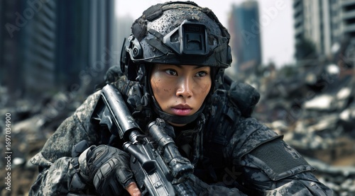 woman, asian, soldier, special forces, ground, rifle, carrying, equipment, tactical, zone, conflict, landscape, urban, destroyed, portrait, closeup, armed, soldier, homogeneous, combat, terrorist, war, sniper