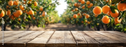 Une table en bois au premier plan et une plantation d'oranges en arrière-plan, concept de présentation de produits mettant en valeur des fruits issus d'une agriculture saine, naturelle et biologique.