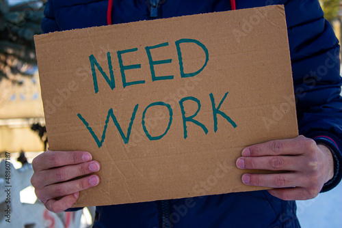 unemployed, man, wants, work, signs, board, holding, unemployment, problem, economic, background, young, closeup, concept, idea, view, losing, job, looking, business, financial, economy, cardboard, people, single, hand, crisis, dismissal, idled, showing, protest, text