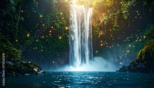 Unfiltered waterfall cascading into a glowing pool, mist illuminated by magical sparkles drifting in the air