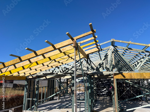 blue, architecture, australia, australian, build, business, carpenter's shop, concrete, construction, crisis, development, economy, engineering, estate, exterior, finance, financial, foundation, frame, framework, home, house, housing, incomplete, industrial, industry, loan, timbering, material, mortgage, new, nobody, preparation, property, real, residence, residential, roof, roofing, site, sky, structure, stud, supply, timber, unfinished, urban, wood, wooden