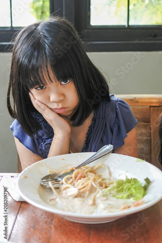 Unhappy Asian girl kid getting bored of food with appetite loss, no hungry habit, eating disorder