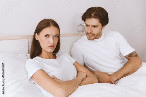 Unhappy millennial european guy calm offended woman with crossed hands on chest on bed in bedroom interior. Arguments, drama and sorry. Troubles and break up, relationship problems and quarrel at home