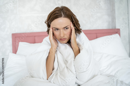 woman, girl, female, lady, person, young, adult, alone, 1, caucasian, home, indoor, bedchamber, diseased, ill, sick, unwell, unhappy, beautiful, cold, flu, infection, virus, bed, sad, sitting, cephalalgia