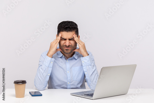 Unhealthy tired businessman sitting office workplace, clasping painful head, suffering severe migraine of overwork and stressful job, worried about troubles. studio shot isolated on white background