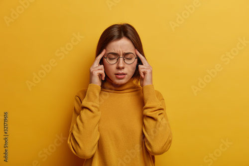 Unhealthy weak woman feels bad, suffers from strong migraine, keeps index fingers on temples, thinks abot something, tries to find solution, closes eyes, feels pressure, isolated on yellow background