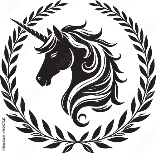 unicorn laurel wreath,elegant vector style,silhouette vector,black and white color