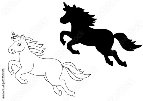 Unicorn silhouette and coloring book. Design element. Vector illustration isolated on white background. Template for books, stickers, posters, cards, clothes.