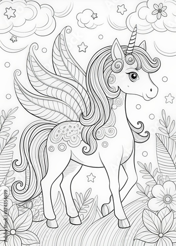 Unicorn with wings and flowers. Coloring book page for adults. Black and white illustration.