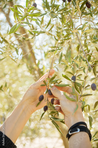 unidentified person holing blanches and picking olive fruits from olive tree
