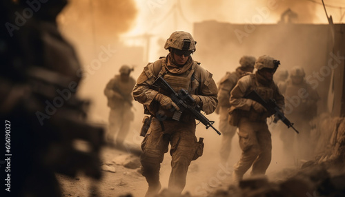 Uniformed soldiers standing outdoors, aiming rifles together generated by AI
