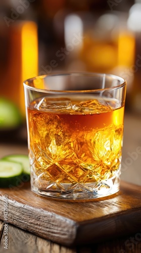 Unique pickle flavored whiskey served in a crystal glass with ice and cucumber garnish