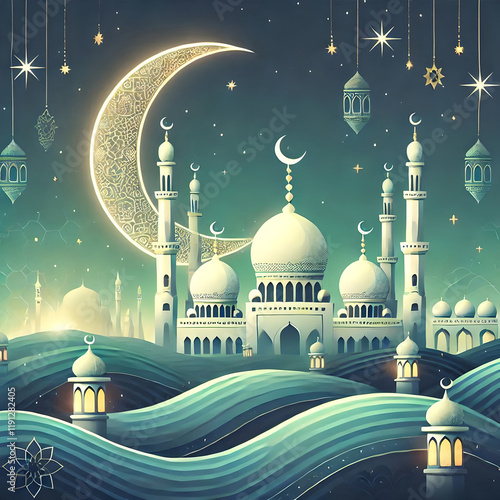 ramadan, lantern, crescent, mosque, islam, muslim, religion, celebration, congratulation, aglow, blue, dark, night sky, star, ornament, pattern, background, image, design, graphic, art, culture, heritage, traditional, spiritual, religious, peace, blessing, fasting, worship, spirituality, beauty, magic, night, calmness, meditation, greeting card