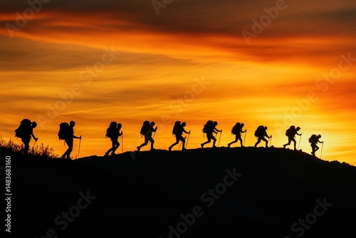 United As One: Silhouettes of Adventurers Climbing a Mountain at Sunset, Symbolizing Teamwork and Collective Endeavors