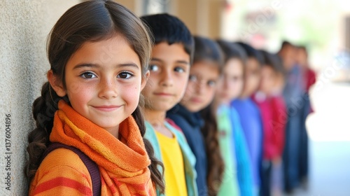 United Front: A row of children stand together, united by camaraderie and innocence, radiating hope, optimism, and potential, preparing for the next step, symbolizing the future