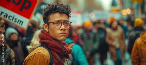 oneness, diversity, rally, protest, signs, racism, goggles, crowd, people, winter, urban, city, awareness, justice, equality, activism, movement, solidarity, community, social, demonstration, peace, support, red, foulard