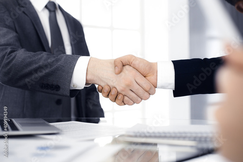Unknown diverse business people are shaking hands finishing up meeting at the desk in office, close-up. Handshake concept