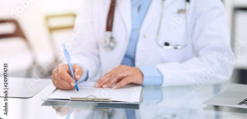 Unknown doctor woman at work, close-up. Female physician filling up medical form while sitting at glass desk at hospital office. Medicine and healthcare concept