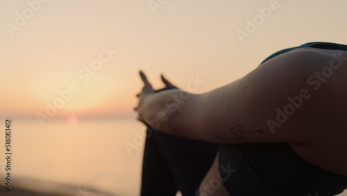 woman, holding, knee, stretching, beach, sunset, sport, girl, yoga, standing, 1, leg, training, balance, fit, sea, unknown, body, physical exercise, nature, activewear, slim, sand, fitness, pilates, sun, beautiful, sky, gymnastics, summer, ocean, closeup, butt, female, sportswoman, practicing, unrecognizable, outdoors, athlete, slow motion, closeup, healthy lifestyle