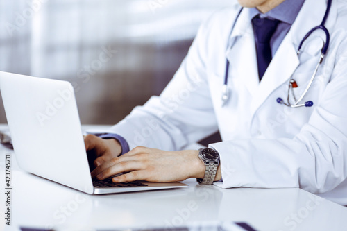 Unknown male doctor sitting and working with laptop in clinic at his working place, close-up. Young physician at work. Perfect medical service, medicine concept