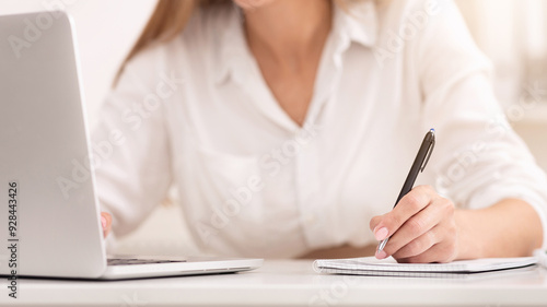 Unrecognizable Businesswoman Sitting At Laptop Taking Notes Studying Or Making Her Schedule Sitting In Modern Office. Cropped, Selective Focus