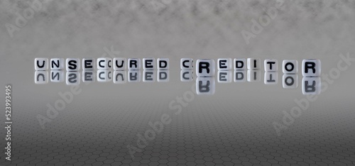 unsecured creditor word or concept represented by black and white letter cubes on a grey horizon background stretching to infinity