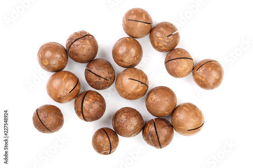 unshelled macadamia nuts isolated on white background. Top view. Flat lay pattern