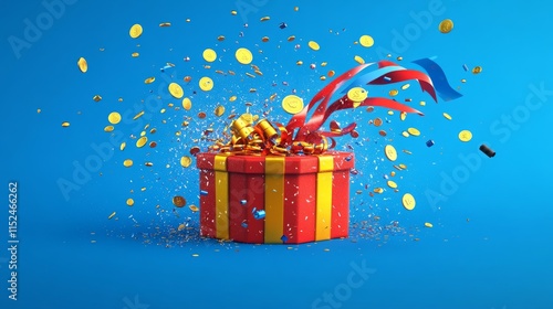Unwrap the gift box filled with golden coins and confetti against a blue backdrop.