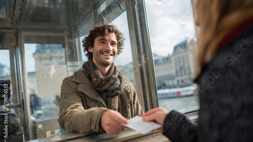 door, ticket, delivery, man, excursionist, travel, city, transportation, relation, smile, windowpane, booking, payment, transaction, ticket window, help desk, vacation, weekend, airport terminal, port, river, cruise, boat, interaction, check-in, reception, path, excursion, case, window, public service, acceptance
