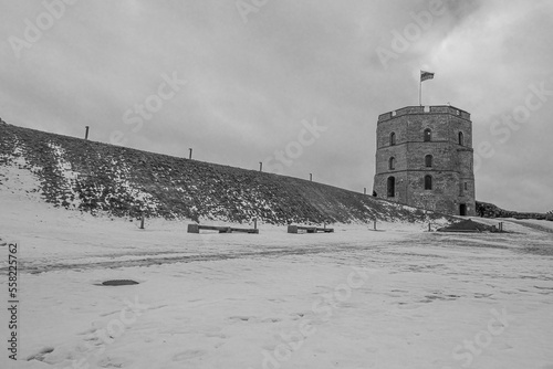 Upper Castle's Gediminas Tower in winter, Sventaragis castle, Vilnius, Lithuania