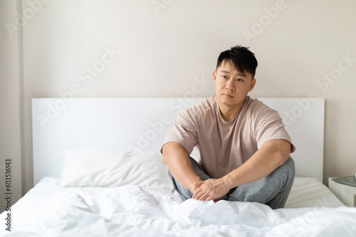 Upset asian man sitting on bed at home, copy space