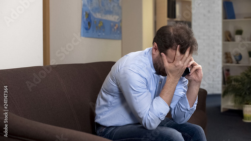 Upset male on couch talking to boss on smartphone, problems, losing job