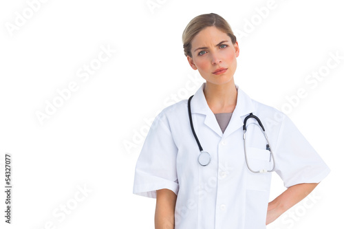 20s, young adult, woman, female, caucasian, white background, nurse, practitioner, stethoscope, medicals, tunic, uniform, specialist, health care, career, job, profession, occupation, blond, pretty, attractive, beautiful, standing, portrait, confused, angry, frustrated, annoyed, upset, irritated, puzzled, thinking