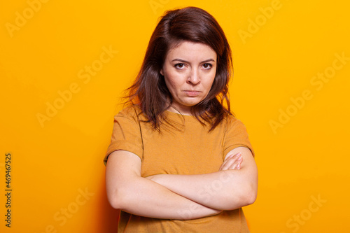 Upset woman standing with crossed arms in studio, showing disapproving and displeased facial expression on camera. Portrait of disappointed person doing grumpy and serious pose.