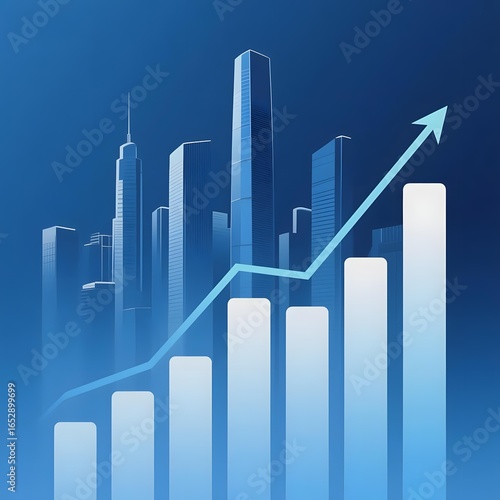 graph, bar chart, growth, arrow, city landscape, skyscraper, blue, background, economy, statistic, progress, financial, increase, urban