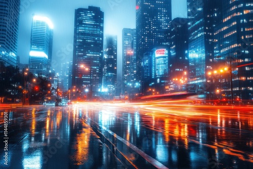 city, urban, night, light, street, road, wet, blurred, traffic, motion, building, skyscraper, downtown, skyline, city landscape, modern, architecture, evening, illuminated, dark, glow, metropolis, transportation, rush, speed, travel, scene, perspective, view, background, abstract, vibrant, infrastructure, outdoors, exterior, business, commercial, destination, journey, path, route, avenue, way, twilight, illumination, energy, flow, streak